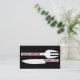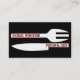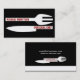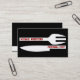 Personal chef minimalist business cards black white, featuring a white knife and a fork on black background and text in red. Perfect for head cooks, personal chefs, chef de cuisine.
