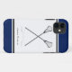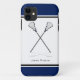 This iPhone 5/5S Case features a pair of lacrosse sticks crossed on front and back of the case. Black, white and blue bands are across the top and bottom. Personalize with your name and message. Contact us if you'd like a different colour scheme.