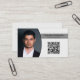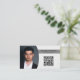 This business card design features a photo placeholder with template name and occupationand your QR code. The back includes text fields for the business name and details . Replace the placeholder photo with your photograph and the QR code placeholder with yours. Fill in the template fields or click customize to select a font style, size, and colour you like. Have the QR code link send potential clients to your website, client reviews, project photos or another specific link. The placeholder photo is courtesy pexels.com.
