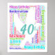 Personalised happy birthday 40th word art poster print. Custom gift idea that can be personalized for any birthday.