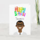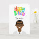 Cute Illustration of a male character with customisable text inside and out and colourful Happy birthday text on the front. All elements can be moved, resized and all the colours can be changed.