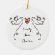 An illustration of 2 beautiful doves holding flowing ribbon with a love heart attached. This decoration is the perfect keepsake to ask your sweetheart to marry you.