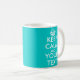 Personalizable Keep Calm Mug with custom colours like turquoise, red or pink. Create your own funny Keep Calm and Carry On parody. Simply edit the text of this template to make a unique design. Popular examples are: Keep calm and party on. Keep calm and love me. Keep calm and drink tea. Personalized mugs are a great gift idea for friends and family.