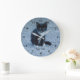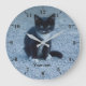 Personalize (add your text or change the image) of a Tuxedo (black and white) kitten photography designed on Zazzle Wall Clocks. This is cute baby cat sitting and watching. It's a black kitty but white spots on its neck, chest and toes. There is also a white spot near its nose. And the kitty's whiskers are also white. Its grayish-blue eyes look straight at you.