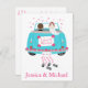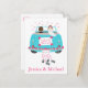 This adorable Just Married wedding announcement post card features a bride and groom driving away in their blue turquoise wedding car with tin cans and flowers surrounded with pink hearts. The card can be personalized with the names of the bride and groom, a family or business name.