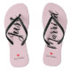 These adorable pale pin flip flops feature "Just Married" in large black script and your personalized name in black print with a red heart