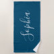 Personalize Name White Script Vertical, Ocean Blue Beach Towel