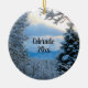 A peaceful and serene view of the snowy Rocky Mountains in Colorado through pine tree branches, with an overall blue tint. Personalize with your own text or date to give someone a special customized memory souvenir of a ski trip or hiking trip or just a visit to beautiful Colourful Colorado.