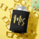 Keep your drink cans cool with this stylish can cooler featuring the word "Mrs" in faux gold foil brush script against a black stripes pattern background. It makes a great gift for newlyweds or anniversaries. If you wish to make your name stand out better against the dark background, change the font colour to a lighter colour or for a gold-like colour use this colour code #c6a74d. For other matching items see here https://www.zazzle.com/collections/brush_script_and_stripes-119702950275442900