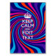 Your personalized Keep Calm saying on a vibrant multicolored swirl decor. A personalized Keep Calm style saying on a one of a kind gift. Humourous or whimsical try on your creative words on two editable lines of text. Remember to use CAPITAL letters for best results.