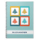 A graphic illustration of 4 christmas trees, tiled in a poster style. Retro colours - yellow. orange, blue and green. Cute and festive. Personalize with a name.