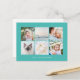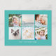 Personalized 6 family photos professional turquoise blue Universal Greetings Postcards featuring a stylish photo collage with 6 customized images, your greetings message in elegant handwritten script font, your name, date, year, message on the back in a modern and simple sans serif font.