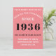 For those born in 1936 and celebrating their birthday party we have the ideal birthday invitation card. The pink background with a white and black design is simple and yet elegant. Easily customize the text to the front and the rear of this birthday invitation card using the template provided. Part of the setting standards range of cards, party supplies and gifts.