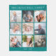 This keepsake fleece blanket features a collage of nine of your favourite square family photos on a teal blue background Add your family's name at the top and establishment date or other text at the bottom in white serif font.