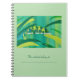 Unique abstract green, yellow, and blue, chameleon, with the text, This notebook belongs to _________________, is printed on custom notebooks. The chameleon is sitting on a branch among leaves of the same colour as the chameleon. The background behind the picture is light olive green. Both the text and the background colour can be customized. Thank you for shopping at CherylsArt on Zazzle.