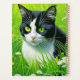 Cute tuxedo black and white cat sitting in a meadow of white daisies.  Ai art.