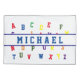 Kids Personalized Alphabet design features a white background to the alphabet in bright, colourful stencil lettering. Child's name is displayed across in blue. Also available in red. Designed to coordinate with the "ABC Baby Shower and Nursery Collection."