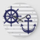 This decorative design features both a dark navy blue anchor and a boat helm wheel with grey and white stripes. The nautical illustration creates a modern and unique wall clock with personalized text and background colour.