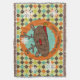 Beautiful Christmas holiday throw blanket features a cute red nosed reindeer on a background of brown, cream, aqua, orange, and mustard argyle, a strip of solid orange, and an aqua blue centre with white polka dots and snowflakes. Easily customize this holiday throw blanket with your name!