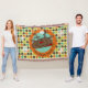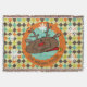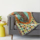 Beautiful Christmas holiday throw blanket features a cute red nosed reindeer on a background of brown, cream, aqua, orange, and mustard argyle, a strip of solid orange, and an aqua blue centre with white polka dots and snowflakes. Easily customize this holiday throw blanket with your name!