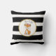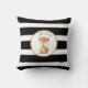 A pillow featuring a woodland themed design with an illustration of a baby fox wearing a flower crown. Skunk sits inside a circle with pom pom inspired trim.
