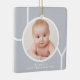 Cet élégant ornement photo de Noël pour bébé est décoré avec le mot JOY en blanc sur un arrière - plan gris. Facilement personnalisable avec votre photo et votre nom. Convient à un bébé garçon ou une fille.