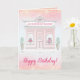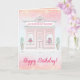 A pink feminine birthday card with the ability to personalize the bakery name for the birthday person! The design includes an illustrated exterior of a bakery cafe shop, with cake and cupcakes in the window, bordered with a pink and gold glitter design. This birthday card is a good fit for a young birthday girl, bakery owner, someone who loves being in the kitchen, and women in general who love feminine things.