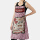 This bright and cheery apron is a wonderful gift for Dad for Father's Day! A large square has a barbecue grill and condiments in it along with typography including steak, barbecue, tomatoes, lamb, marinade, vegetables and more. Background is red and white gingham check and the top has a solid red panel with a black border for you to personalize with your Chefs name.