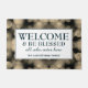 Personalized Beige Bokeh WELCOME Doormat with the wording WELCOME & BE BLESSED ALL WHO ENTER HERE plus placeholder name. The background is a turquoise bokeh pattern. All text is CUSTOMIZABLE so you can amend the wording to suit your needs.