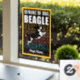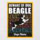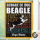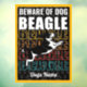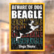 Personalize this Beware of Dog window cling featuring an Beagle dog jumping in front of vintage coloured BEAGLE typography. Edit top BEWARE OF DOG text and edit DOGS NAME. Great Beagle dog sign for warning others.