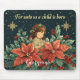 Bring a touch of Christmas joy to your workspace with our Personalized Biblical Nativity Child & Verse Mouse Pad. This beautifully designed mouse pad features the timeless phrase “For unto us a child is born” in an elegant font, adding a sense of faith and reverence to your daily routine. Below the verse, a young child dressed in a light robe with a holly and berry garland stands amid festive red poinsettias, holly leaves, and pine branches, creating a traditional Christmas scene. The dark, starry background with golden snowflakes adds a magical and serene holiday ambiance.