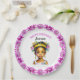 Pretty little girl of colour Princess with a tiara and pink flowers in her hair. Add name in personalize area. Birthday party paper plates.