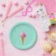 Happy birthday party plates featuring an ice cream cone topped with a birthday candle on a turquoise background.