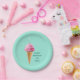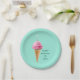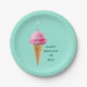 Happy birthday party plates featuring cool ice cream cone topped with a birthday candle on a turquoise background. To personalize edit text to add name.