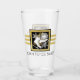 The design features a pair of ice skates over a snowflake crest with black and faux gold glitter background. This elegant winter sports design serves as a cool modern and unique glass tumbler with personalized text.