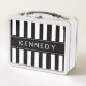 Put your name on this cute striped metal lunch box then look cute when you use it for lunch, display or storage.
