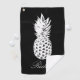 Personalized black golf towel with pineapple image. Elegant golfing gift for men and women who love the game. Classy design with custom name.