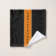 Classic Black Bath Towel Set with two thin white stripes and a wide vertical orange stripe on the centre with custom name on it.
