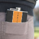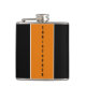 Classic masculine flask with two thin white stripes and a wide vertical orange stripe on the centre with custom name on it.