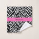 Personalized black and white zebra print towel set. The design features a black and white zebra pattern and a hot pink band in the middle with your custom name.