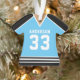 Celebrate your hockey star with this personalized blue and black hockey jersey ornament. Perfect for commemorating a special season, player, or team. Customize it with a name and number to create a unique keepsake.