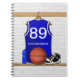 Personalized blue and white basketball jersey hanging in a sports locker room with a basketball, basketball shoes and a water bottle. The sports jersey is customizable with your own number and name to create a truly unique gift for the basketball player or basketball fan.