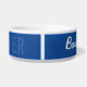 Blue and white personalized dog, cat, or pet bowl with their name in a casual handwritten font, paw print, and "best dog ever" or any custom saying you want for your pet's custom ceramic food or water bowl.
