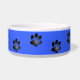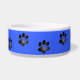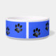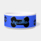 This cute personalized dog bowl features black paw prints pattern and a large black bone pattern in the middle on a cobalt blue background. Customize it by adding your pet's name or any text you wish in the font, font colour and font size of your choice!