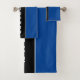 Stylish Royal Blue Bath Towel Set with two thin white stripes and a wide vertical black stripe on the centre and custom name on it.