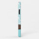 This modern, personalized, aqua blue and white damask Case-Mate iPhone 11 Case with a chocolate brown PRINTED ribbon and jewel brooch has a spot for you to add your name and monogram.