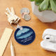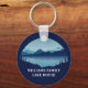 This cool custom lake house keychain features a serene blue river surrounded by trees and your personalized text for a family reunion, camping trip, or summer vacation. Customize with your last name or other group name.