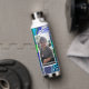 Digital fluid art in blue, white and lime green water or coffee bottle. Personalize it by adding your photo and name to it.