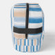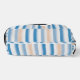 Stylish toiletry bag with modern blue and peach watercolor stripes. Personalize with your name for a unique travel, bathroom, or makeup organizer.
