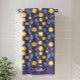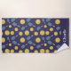 This pickleball beach towel design is complete with a seamless pattern of pickleballs and pickleball paddles set against a dark blue background. There is a place to add your name at the bottom of the towel.